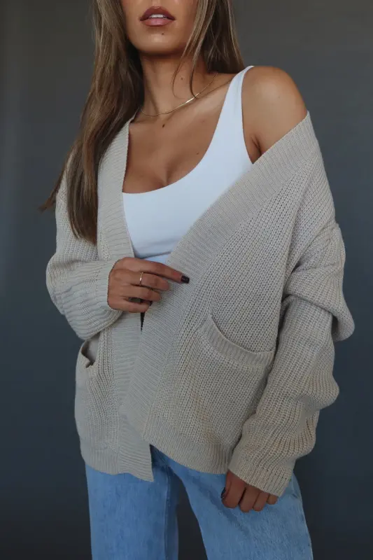 Our Danni Cropped Cardigan is made of a soft-to-the-to-touch thick knit material. This cardigan features a cropped boxy fit, functional pocket details, and an open bodice. The sleeves have more of a loose fit with a tight cuff to give it a trendy look. Pair this cardigan with a pair of jeans for an effortless cute look.