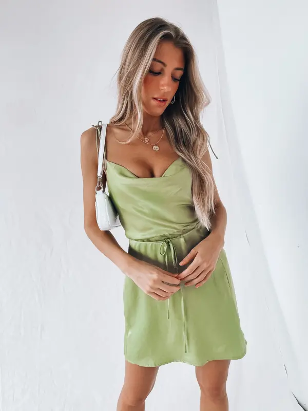 silky cowl neck dress with flattering tie waist detail and prounced waistline