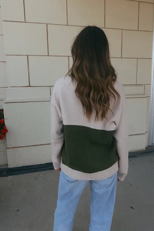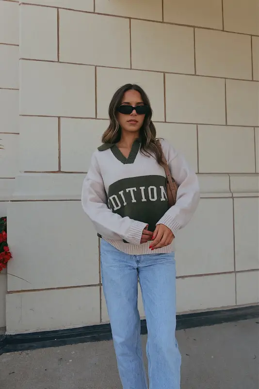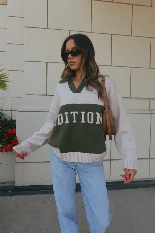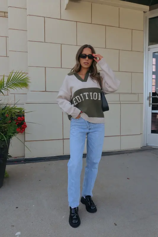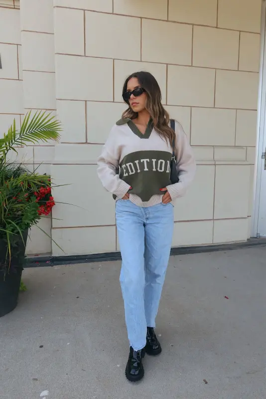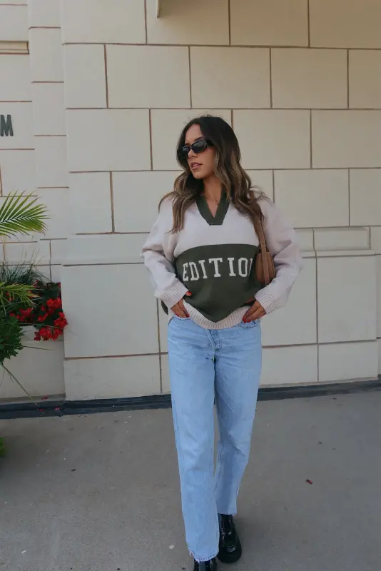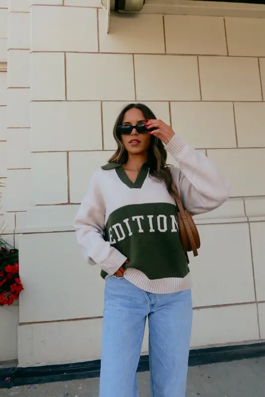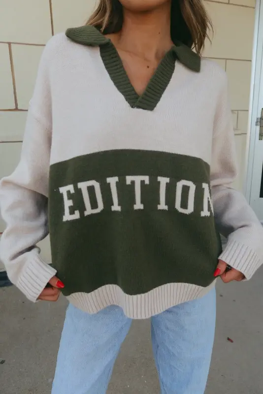 Our Edition Oversized Collared Sweater has a lightweight, soft to the touch knitted fabric. This long sleeved item has a relaxed collar around the neck and a v-neckline. This sweater has a tan and green colorblock with ‘EDITION’ written across the front. There is a ribbed detail on the collar, hemline, and cuffs of the sleeves. Pair this with leather bottoms for a cute look! This item does run oversized!
