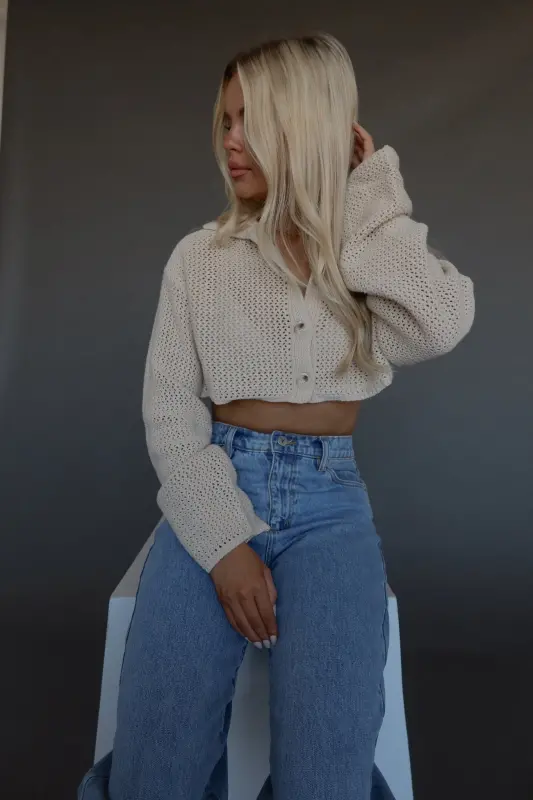 Our Hanna Crochet Cropped Cardigan is a soft to touch knit cardigan with a button up closure on the front. This cardigan features a ribbed collared v-neck neckline, with a boxy fit with oversized sleeves, making an effortless and relaxed look. This cropped cardigan is a very trendy piece for this season. It runs true to size, for a more oversized look we recommend sizing up.