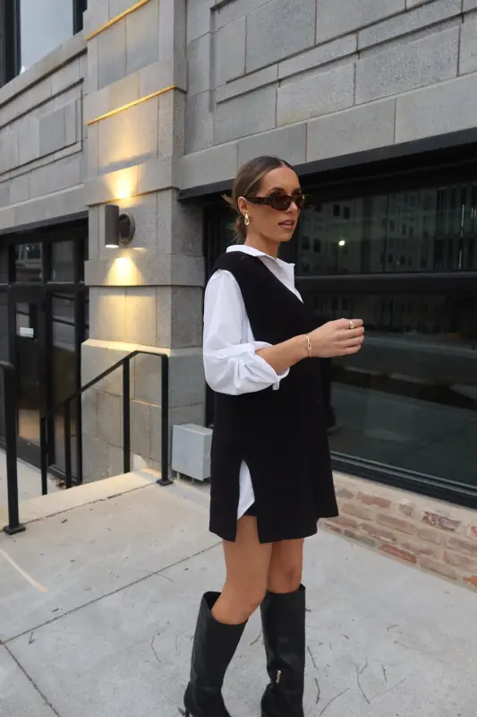 Our Logan Sweater Vest is a sleeveless knit sweater. This sweater features black knit fabric, slits on each side, a v-neckline and a sleeveless design. There is a ribbed detail around the neckline and hemline. This item does run true to size, but is oversized.
