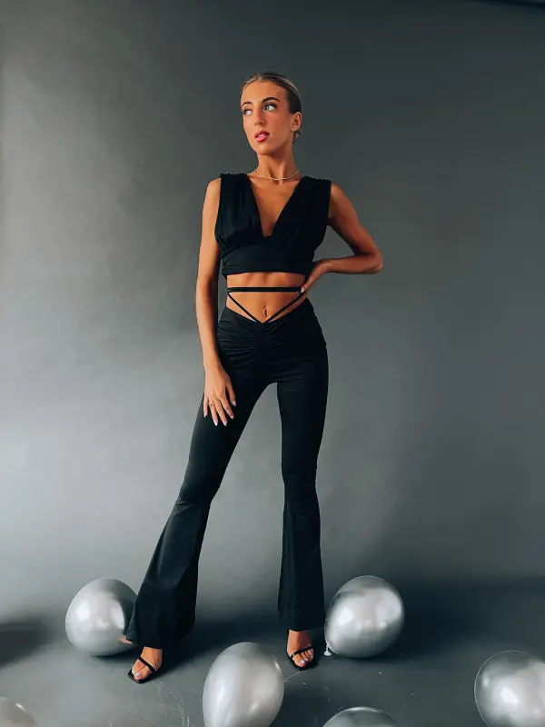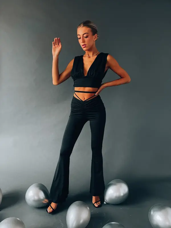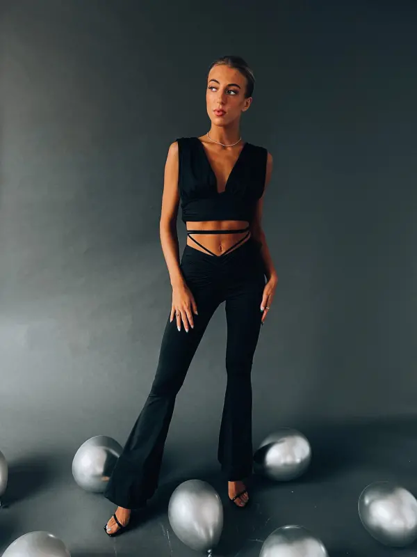 Features: Sleeveless cropped top with plunge neckline, flare pant with elastic waistline, wrap detail on bodice, fitted silhouette