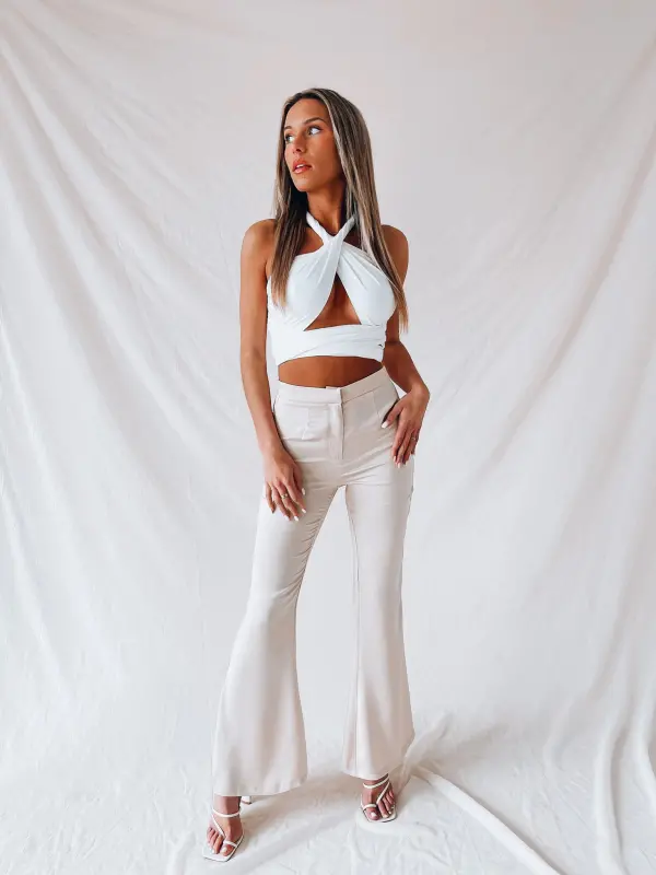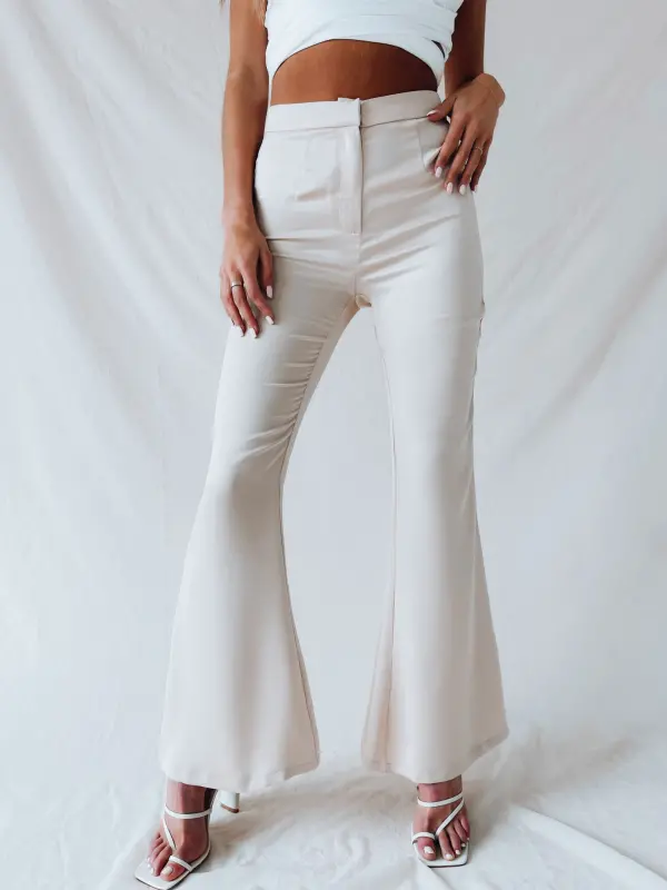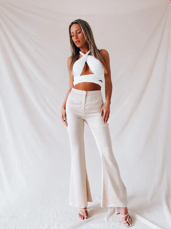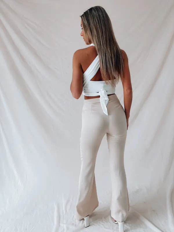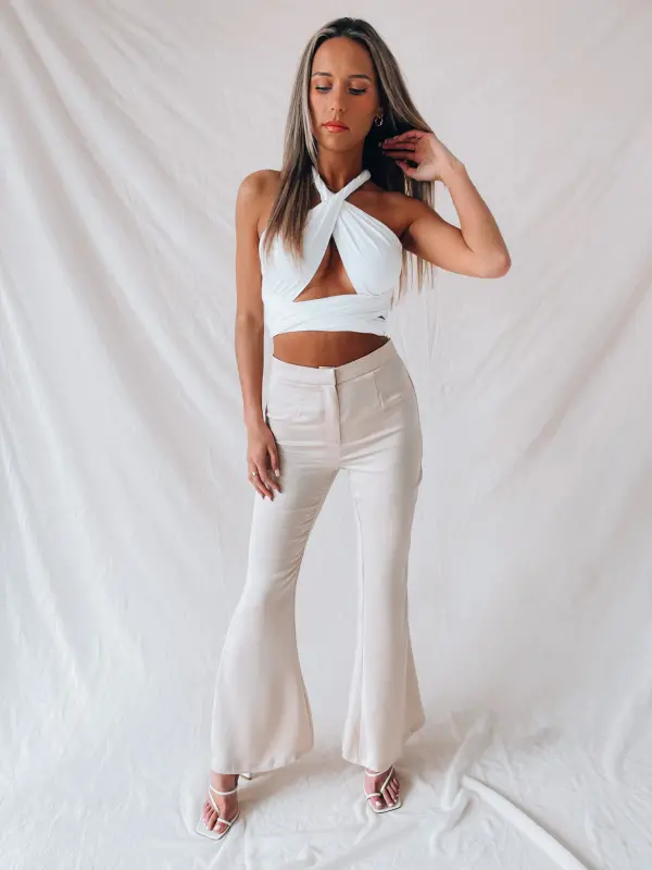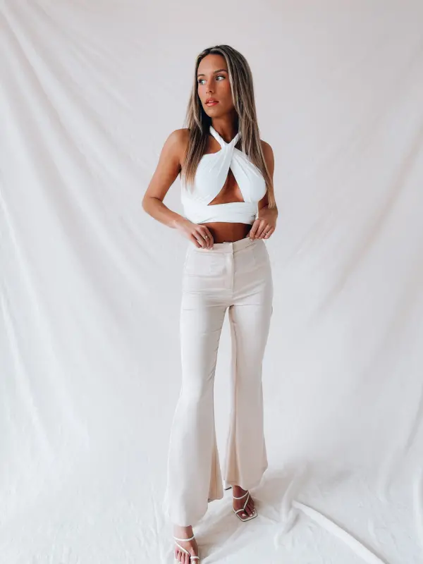 Our Maleena High Waisted Silk Bottoms are a fitted wide leg pant. This lightweight, soft to the touch bottom, is a silky fabric. These pants have a zipper and two hook closure. These pants would look adorably with a strappy heeled sandal and any cropped top or tank!