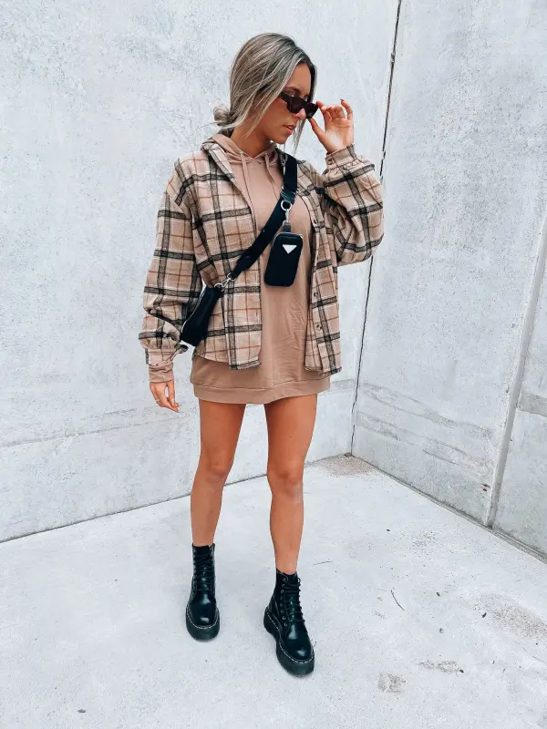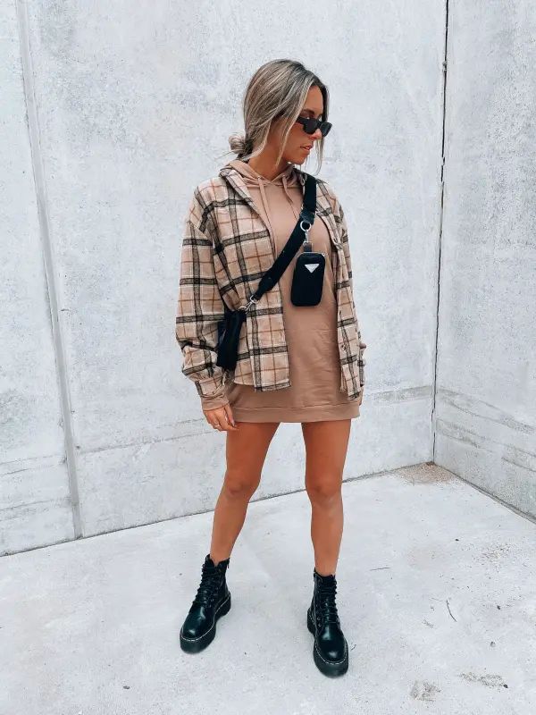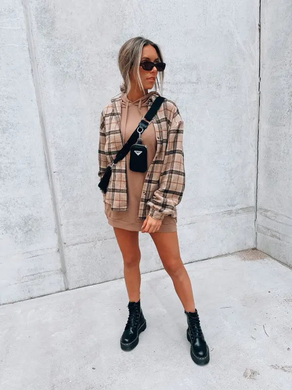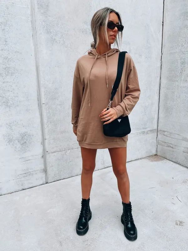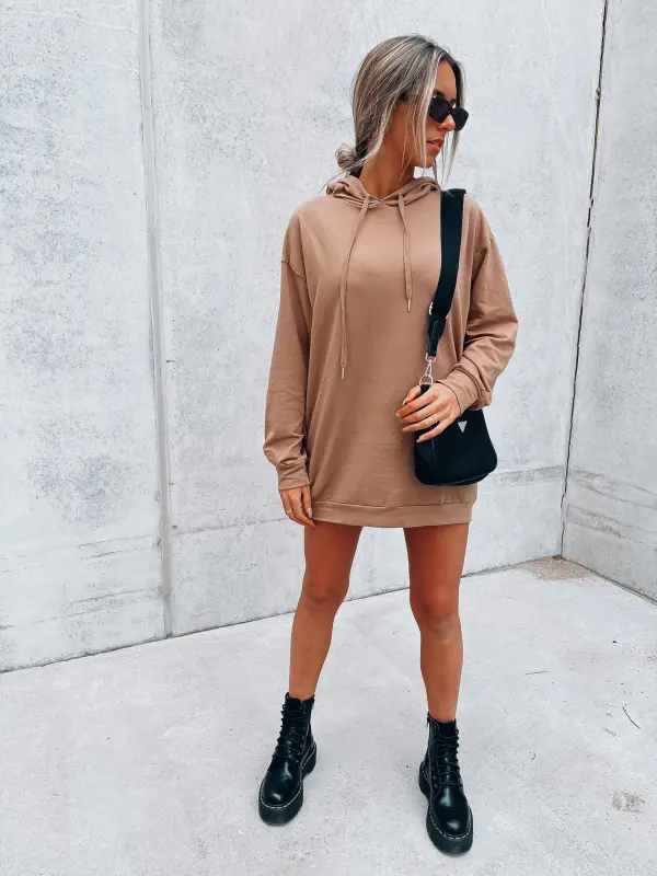 Features: Long sleeve, hooded, soft cami materail, front pockets, full length bodice, relaxed fit silhouette