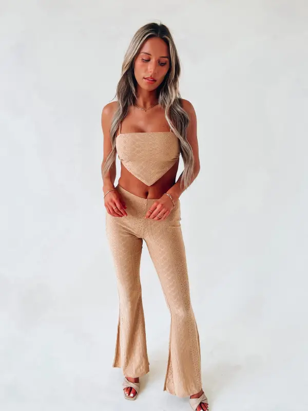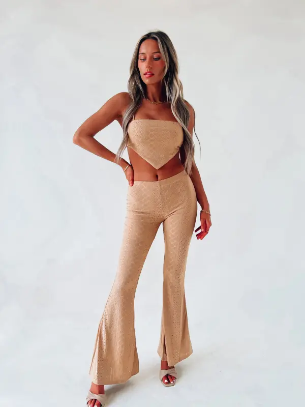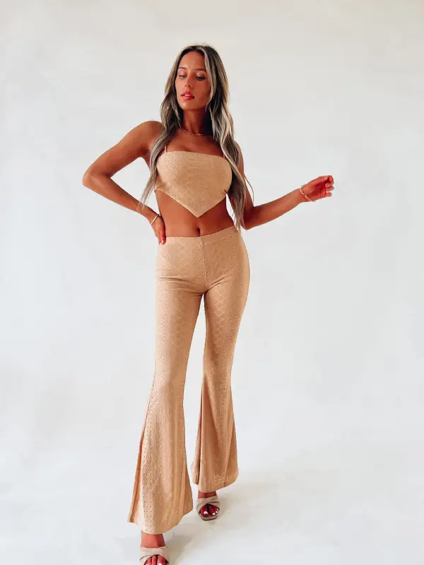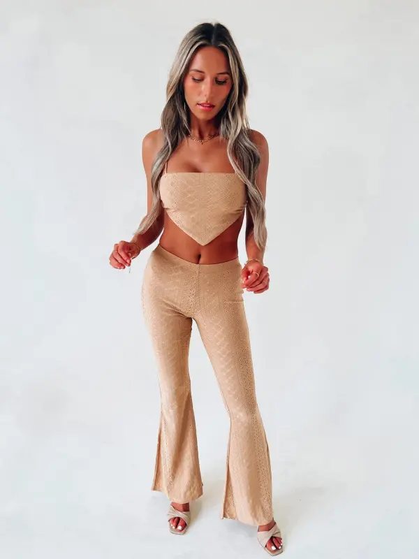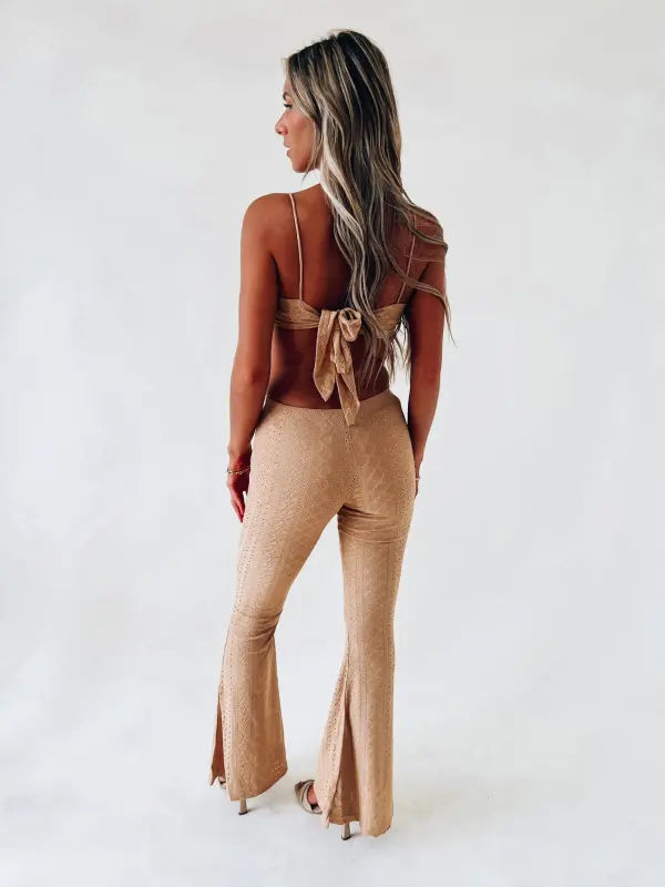Our Willa Eyelet Pant Set has a soft to the touch eyelet lace fabric. The top of this set is a bandana like top with a self tie back closure. The pants have a flare bottom. These are both LINED!